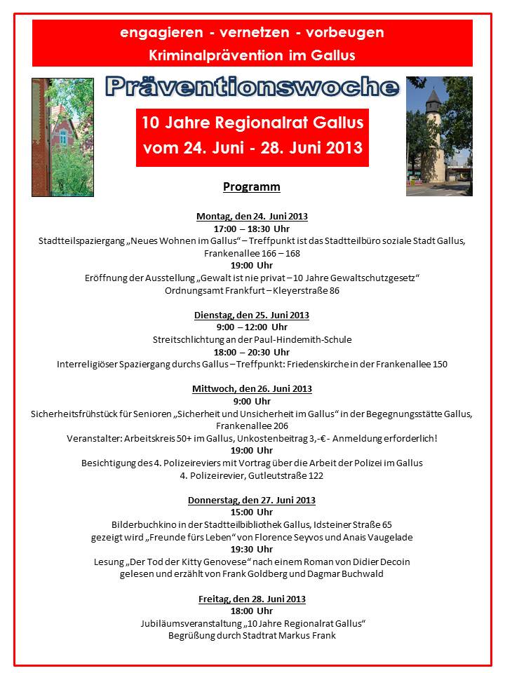 Der Regionalrat Gallus feierte seine 10-jährige Arbeit mit einer Präventionswoche vom 24.06.2013 - 28.06.2013 mit einem interesannten und vielseitigen Rahmenprogramm.