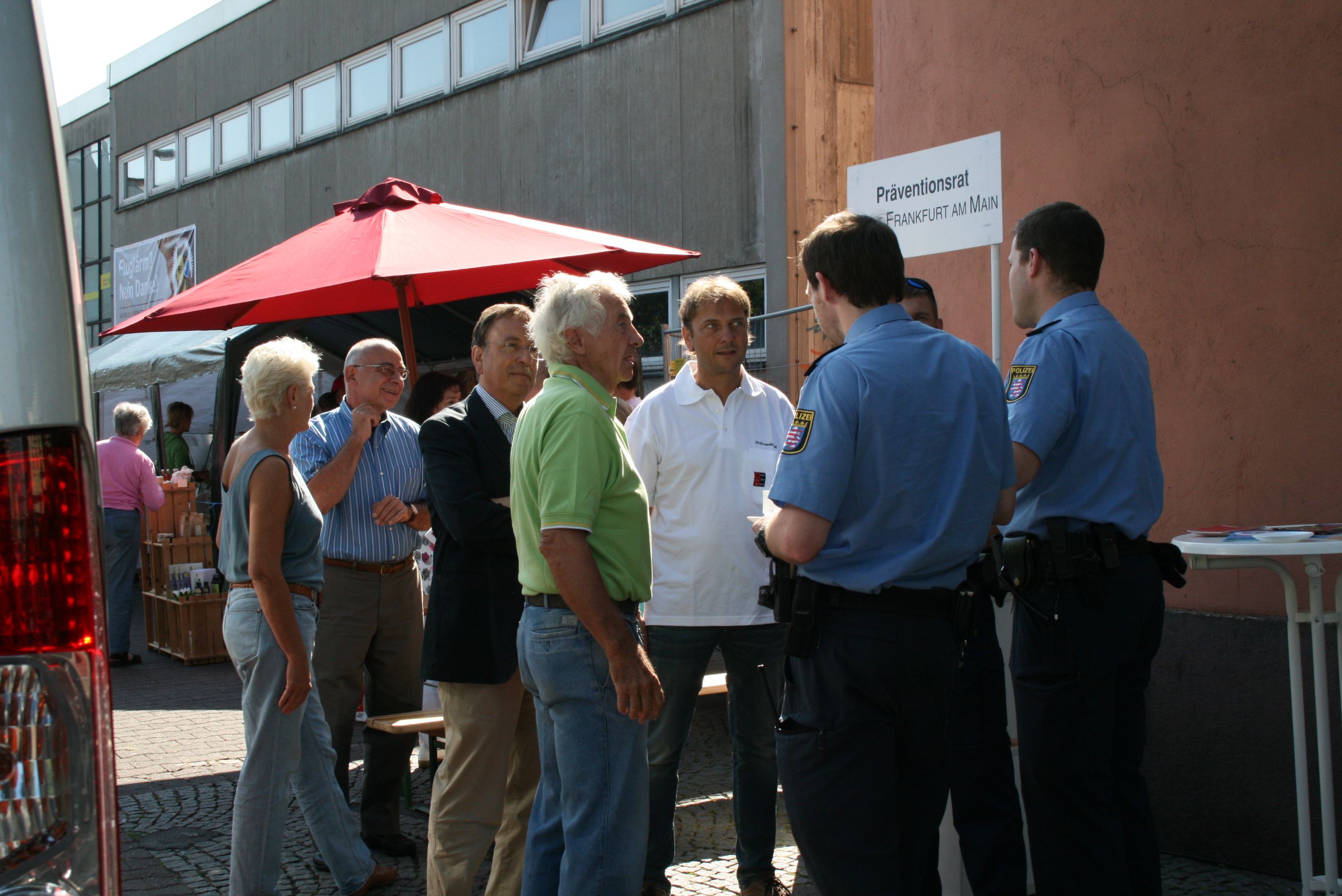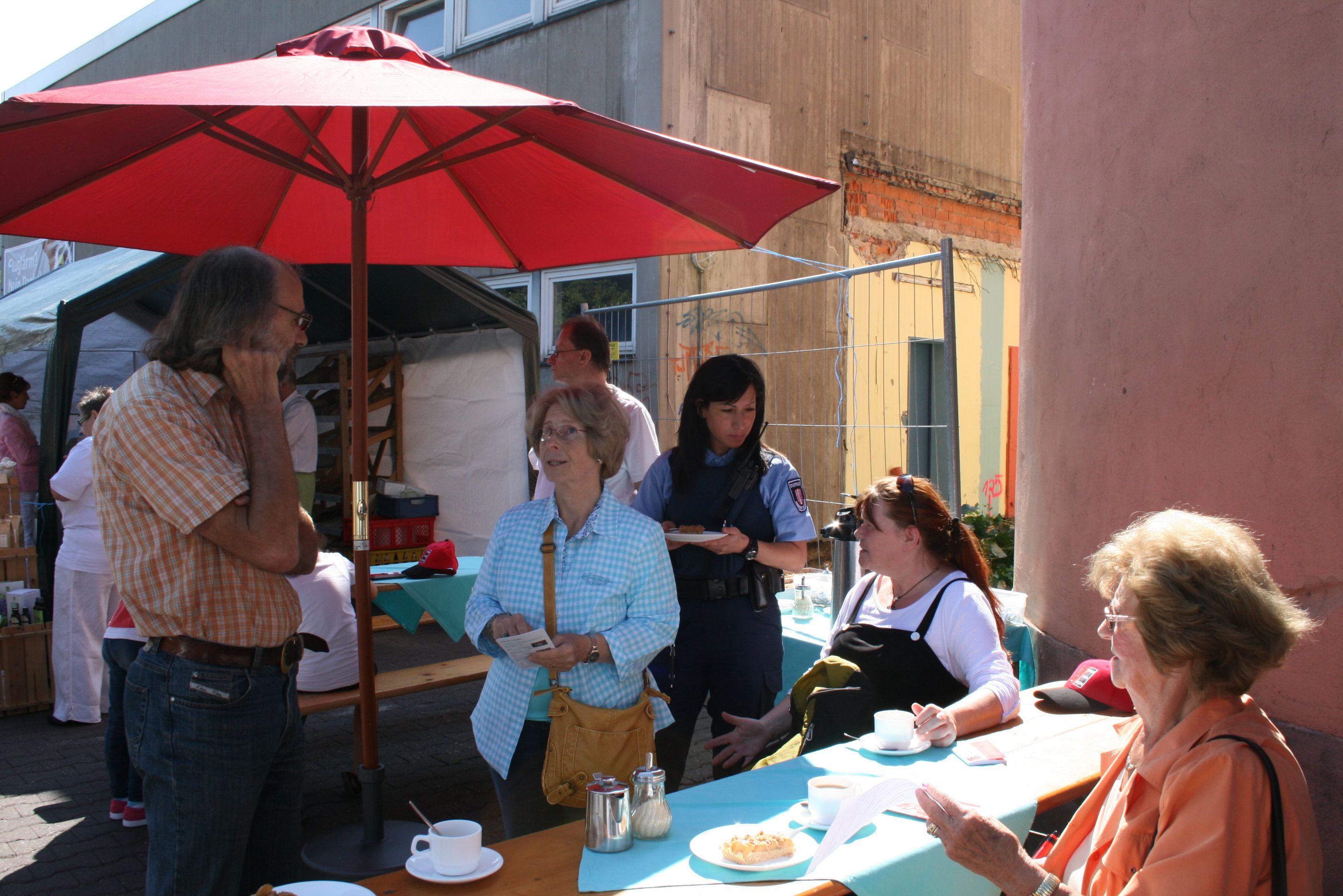 ein Sicherheitsfrühstück für Bürgerinnen und Bürger Niederrads am Stand der Fleckenbühler.